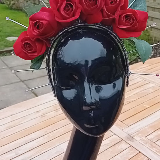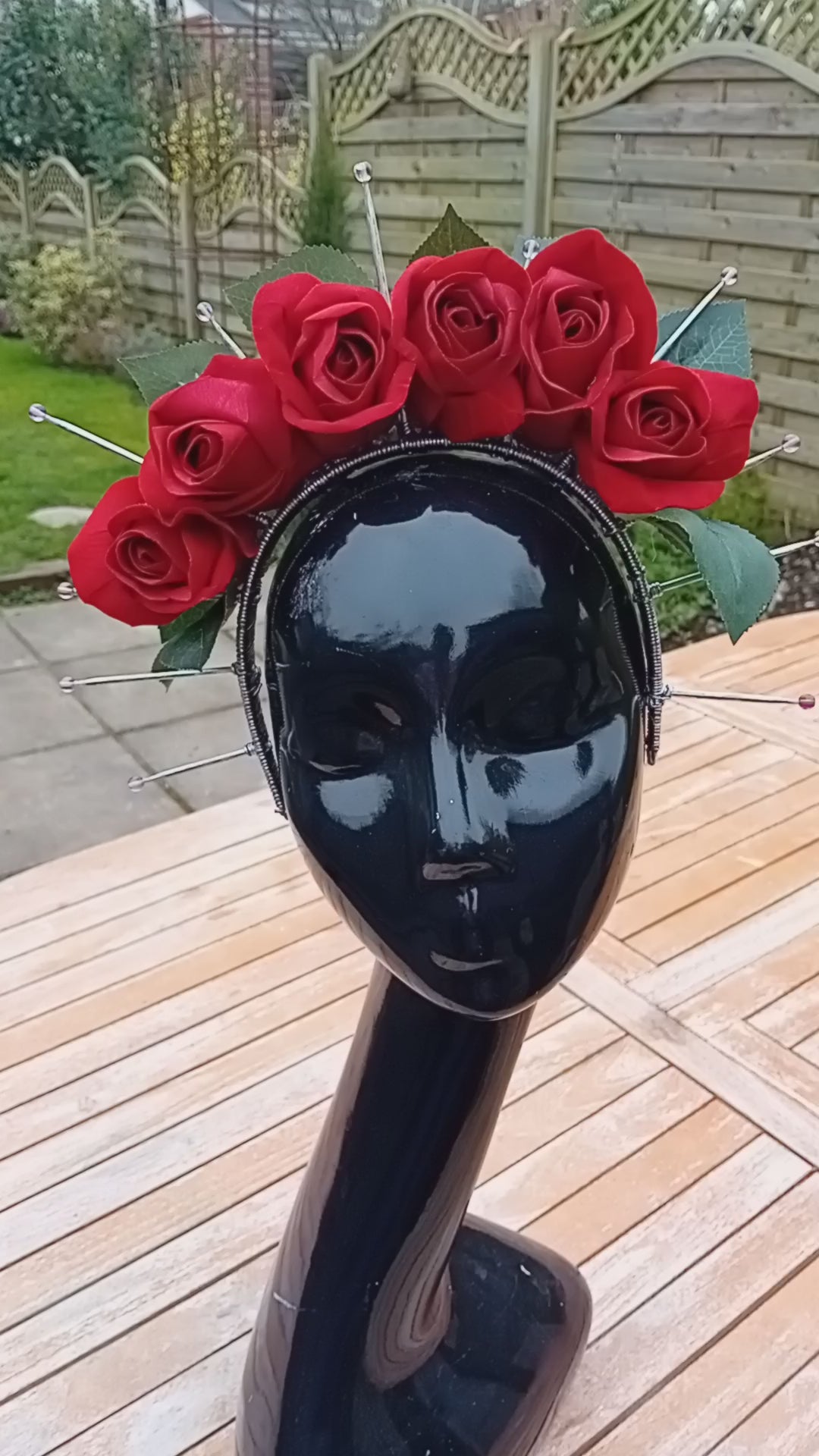 Spiky crown with red roses-the silver spikes are wooden with round beads on the end for safety, the red roses are fabric with velvety touch. Mounted on a comfortable hairband that you can wear for as long as you like!