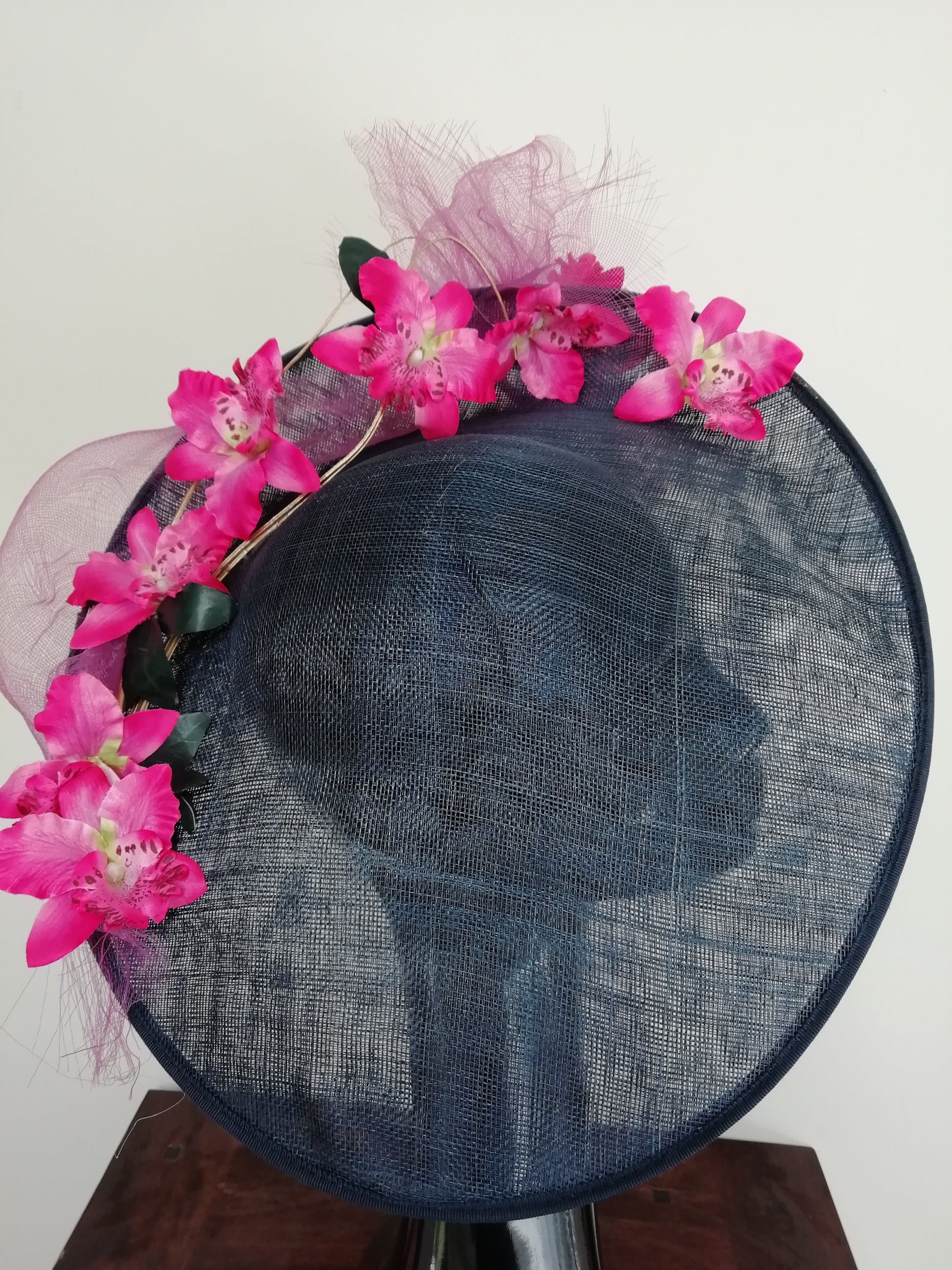 Large dark navy sinamay saucer hat with Fuschia pink orchids