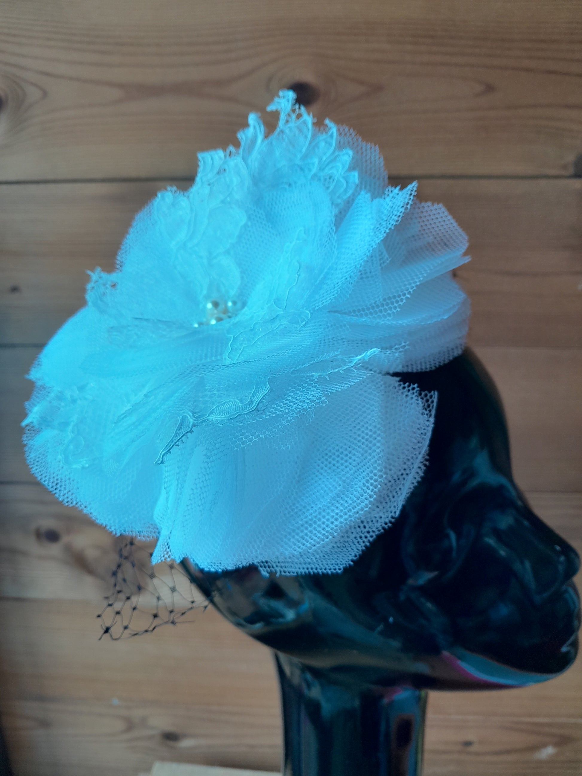 Large white tulle flower with glass pearls in centre attached to a wire comb. Perfect for a statement hair accessory for an alternative bride or wedding guest.