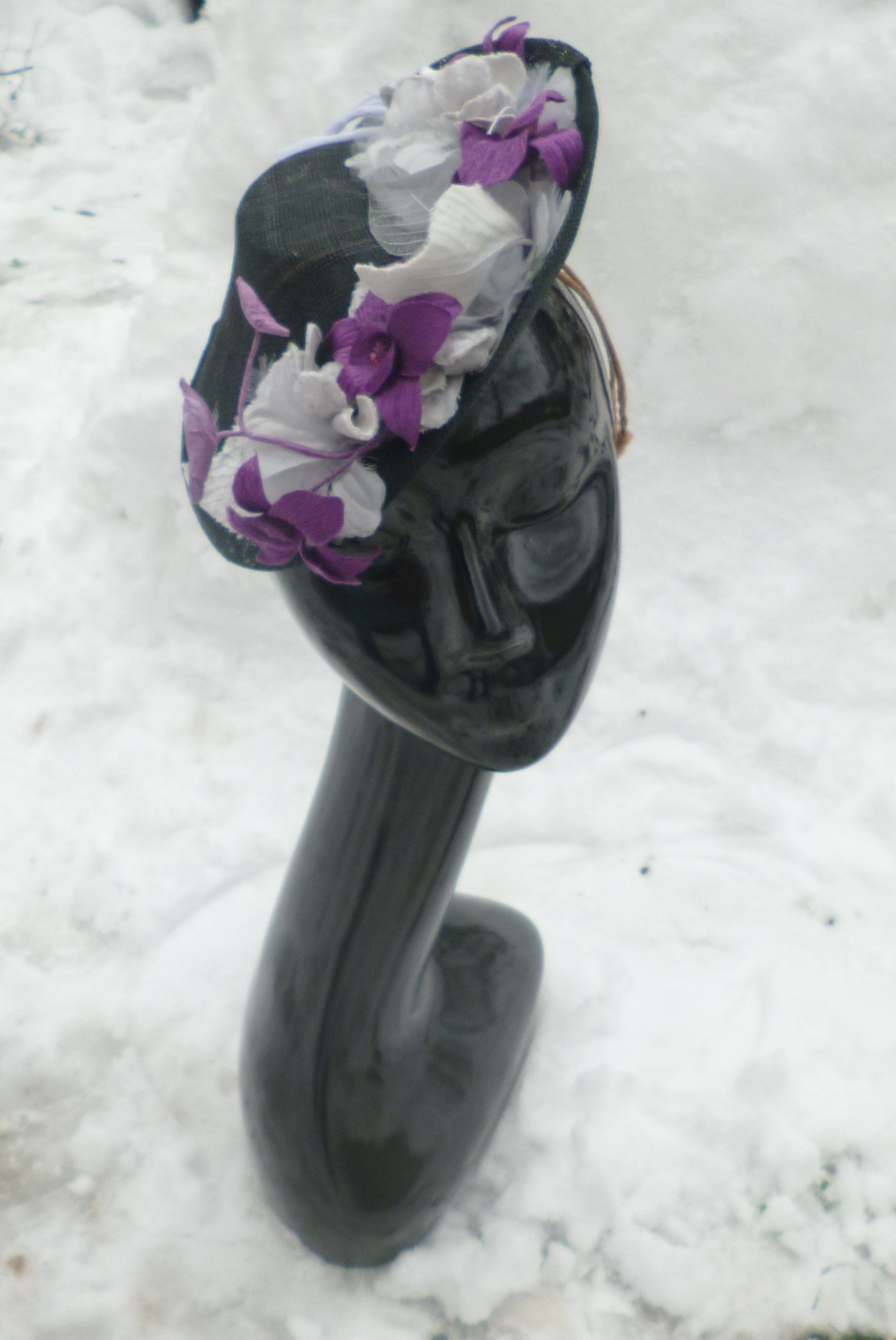 Navy sinamay saucer with ridge and purple velvet orchids,flower/silver leaf spray trim around top.Attached to the head with wire alice band, can be dyed to your hair colour.