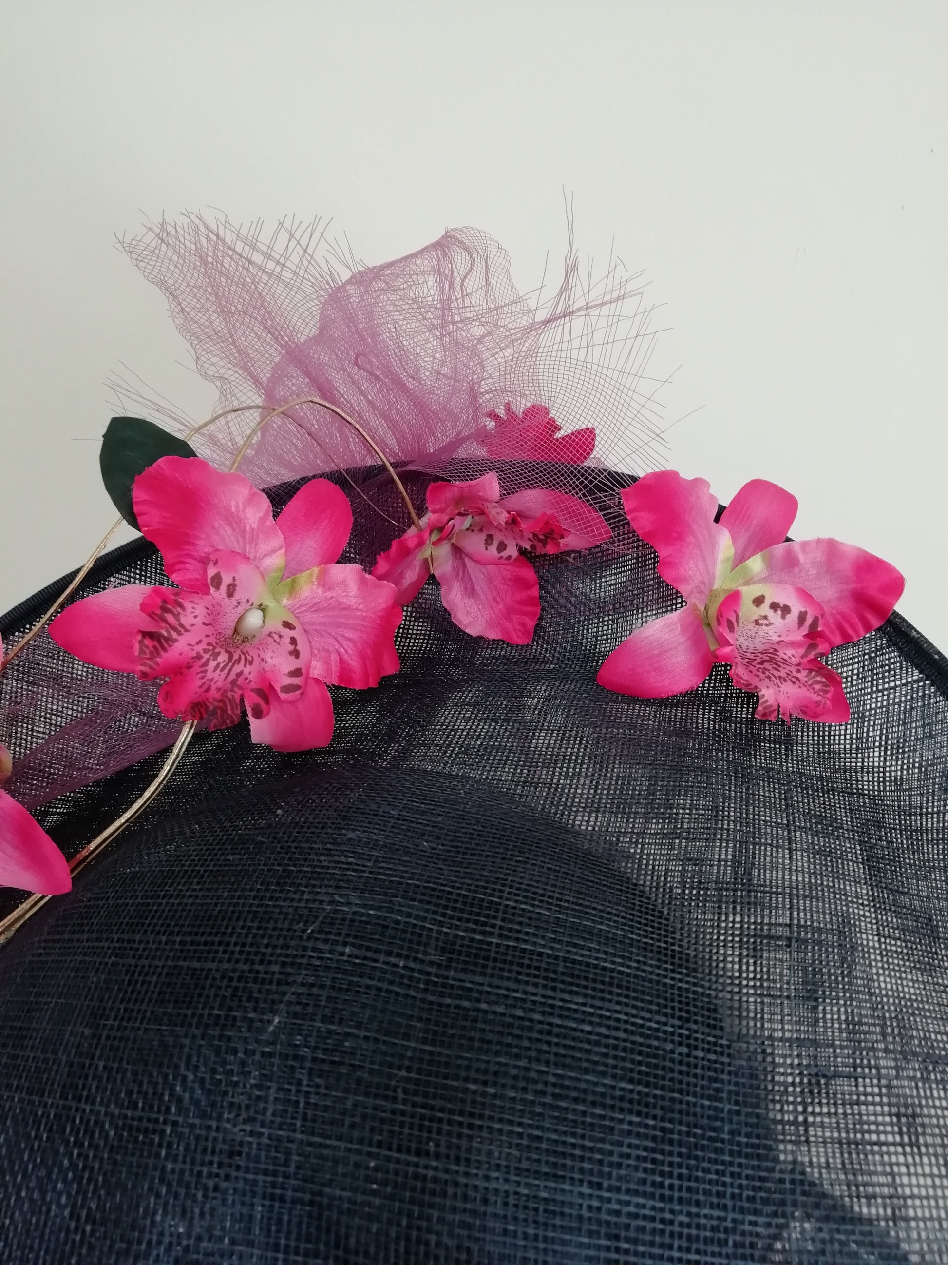 Navy large saucer on navy alice band with Fuchsia pink fabric orchids, handmade leather leaves, gold quills and purple crin. Perfect for Ascot, a wedding or any special event. Saucer Base available  to order in many other colours.