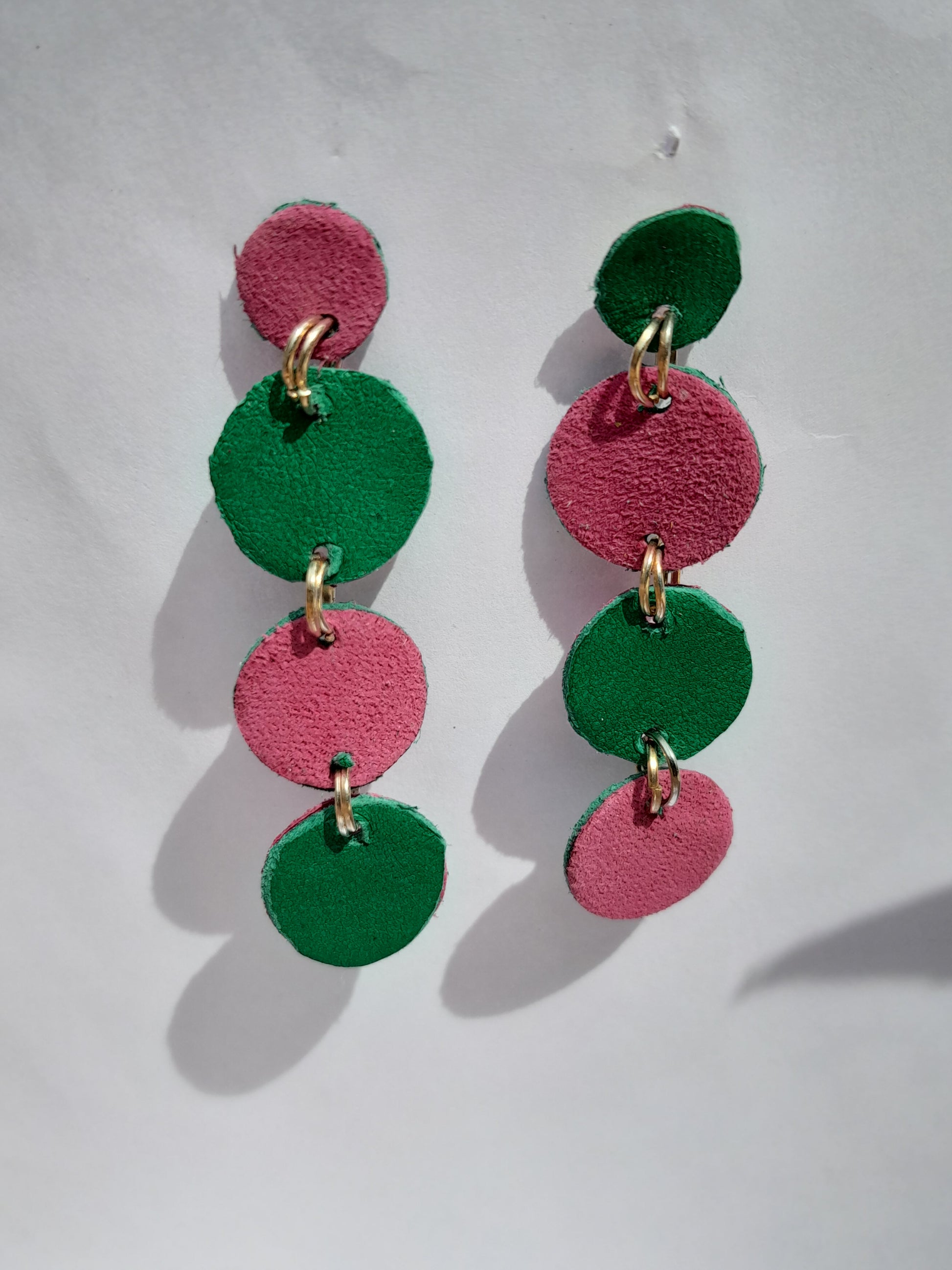 Pink and green leather circles with double chain design attached to gold plated ear posts and soft backs.