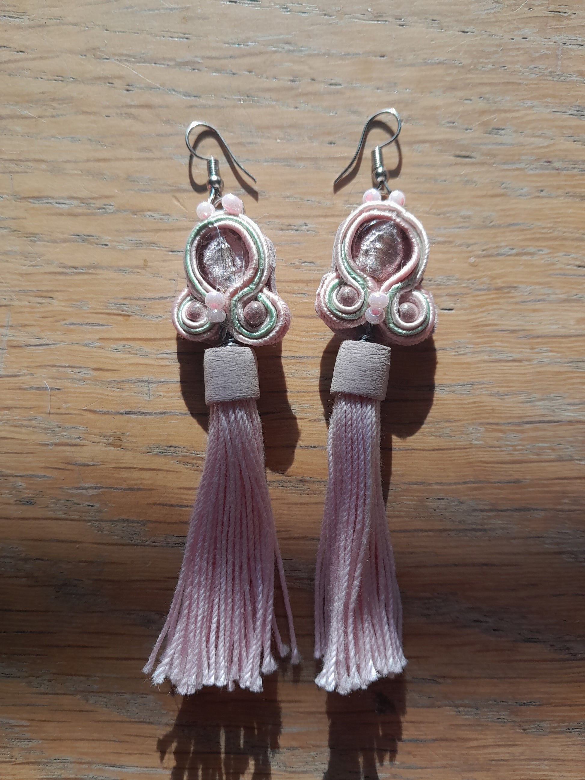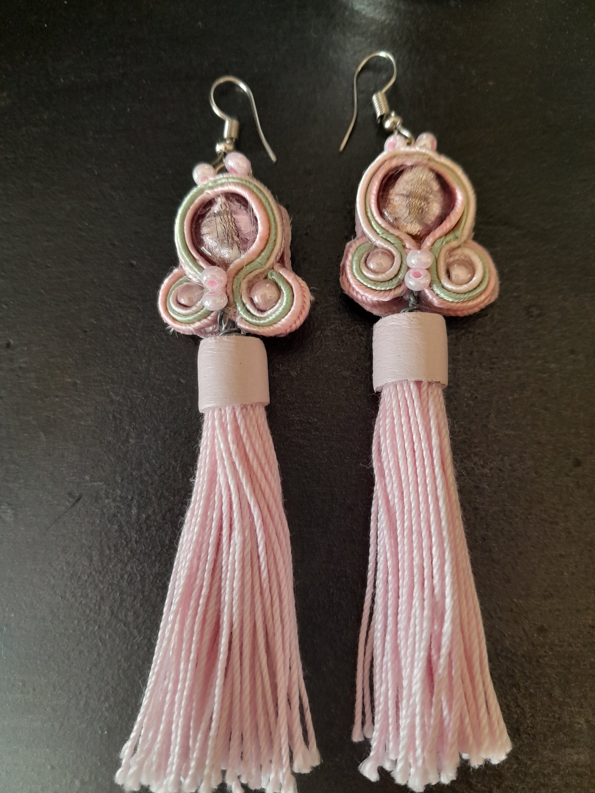 These earrings are handsets with the Soutache technique and a pink tassel with leather top. They are worn with hook earwires. If you have specific requirements for metal earlobes please send a message when ordering.