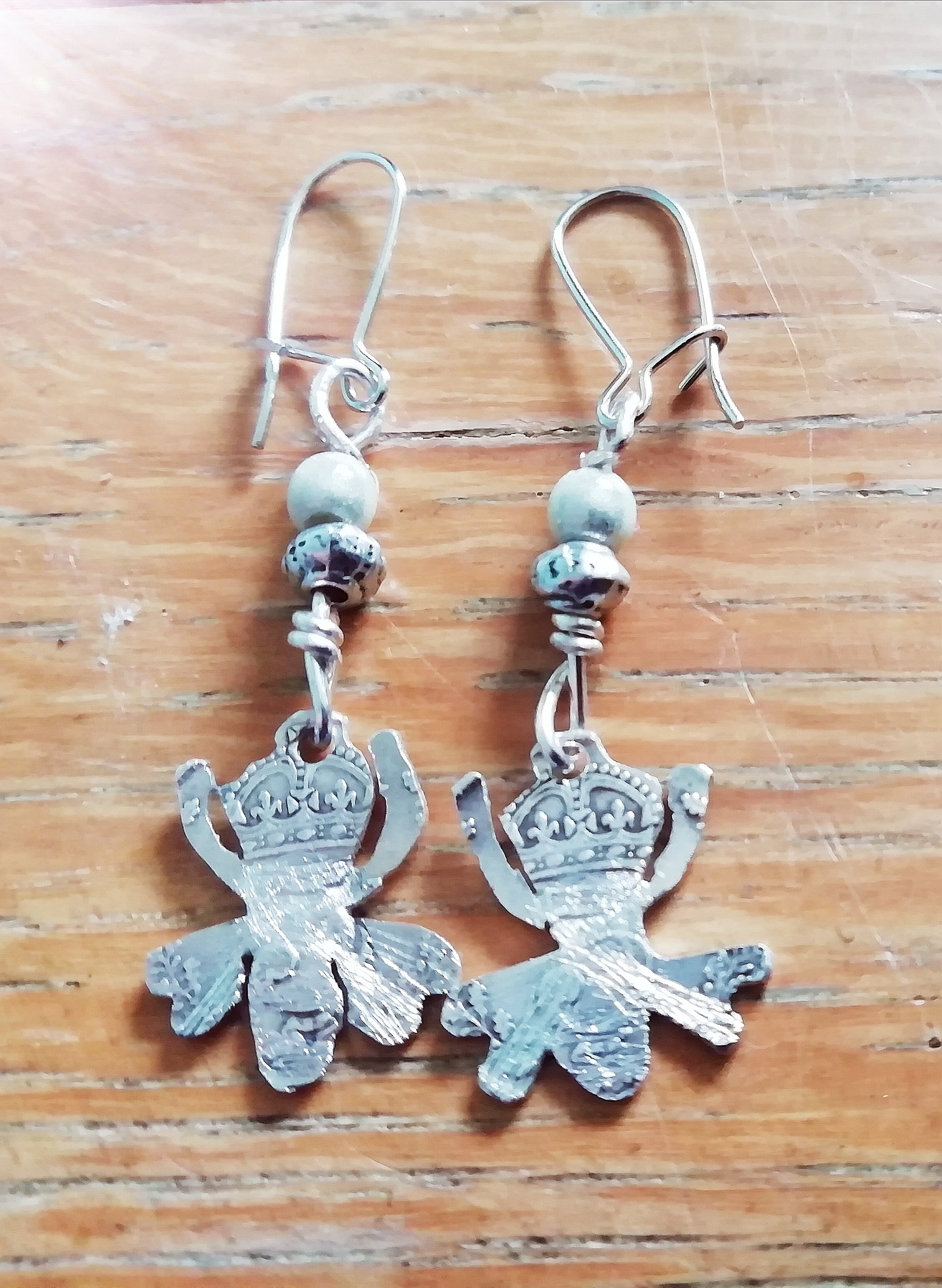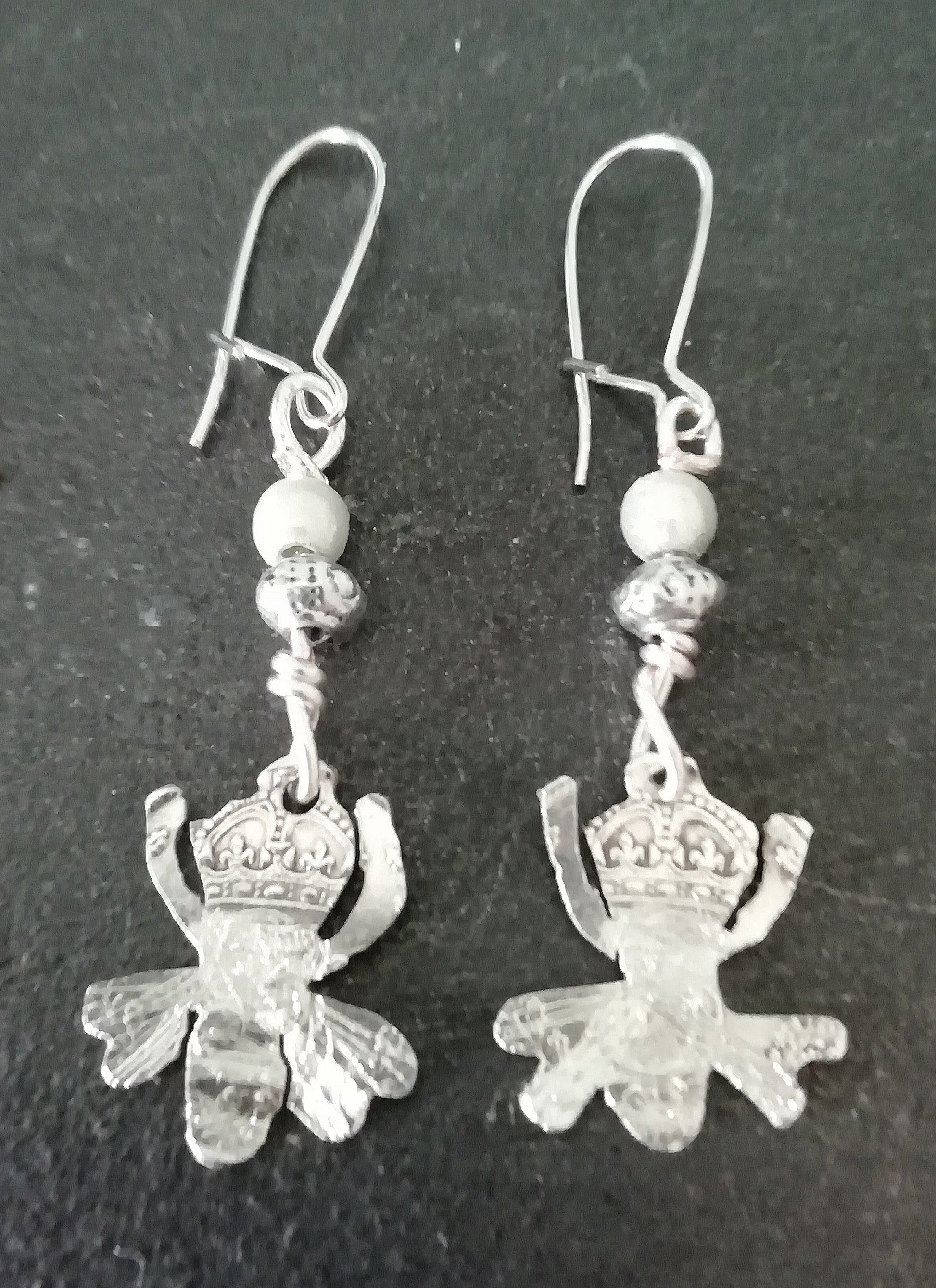 Queen Bee earrings handcut from Upcycled out of circulation pre 1920 threepence coins. Before 1920 these coins were made from at least 95% silver which makes them ideal to use as jewellery. These lovely charms are attached to 925 silver earwires.