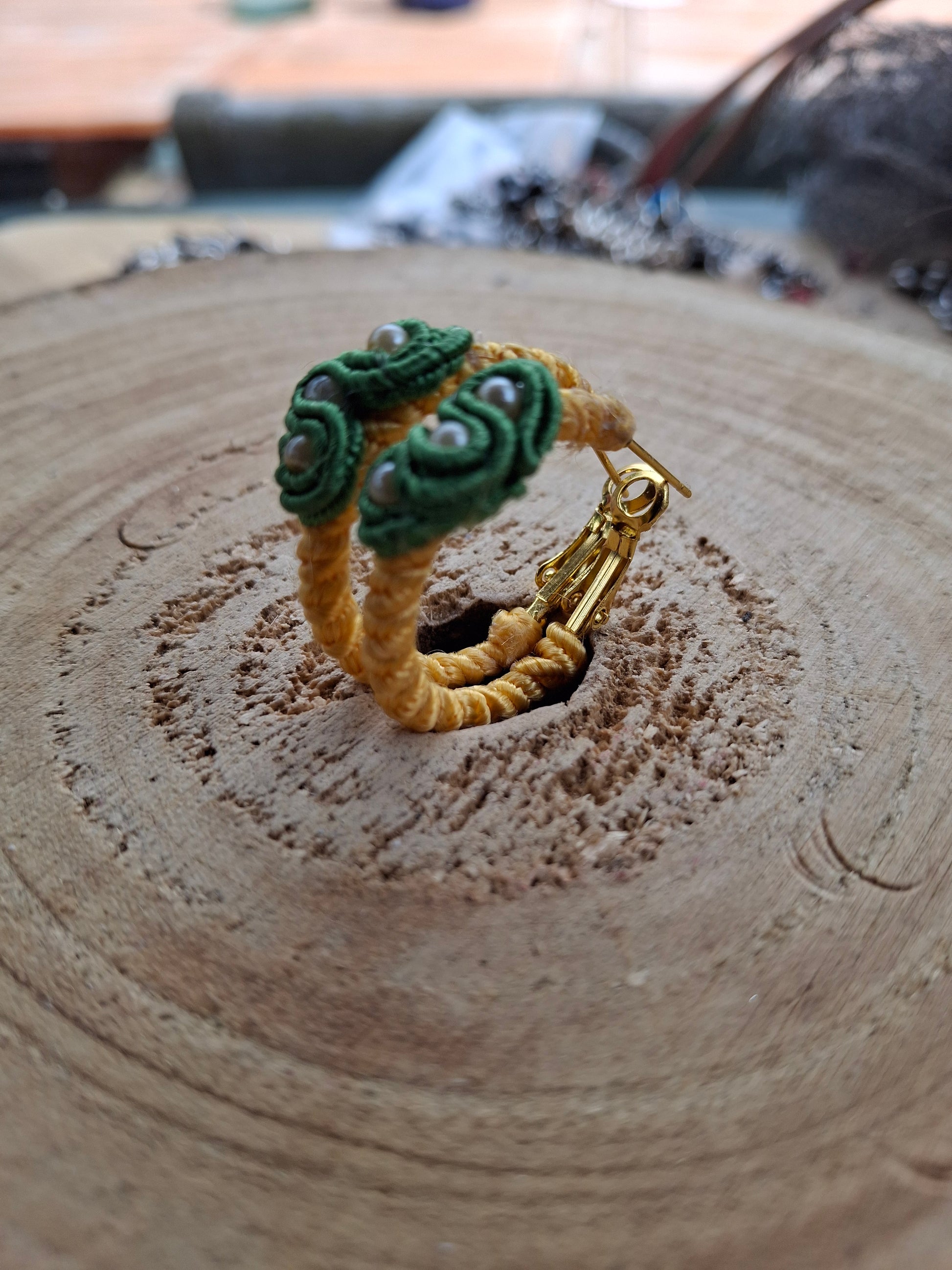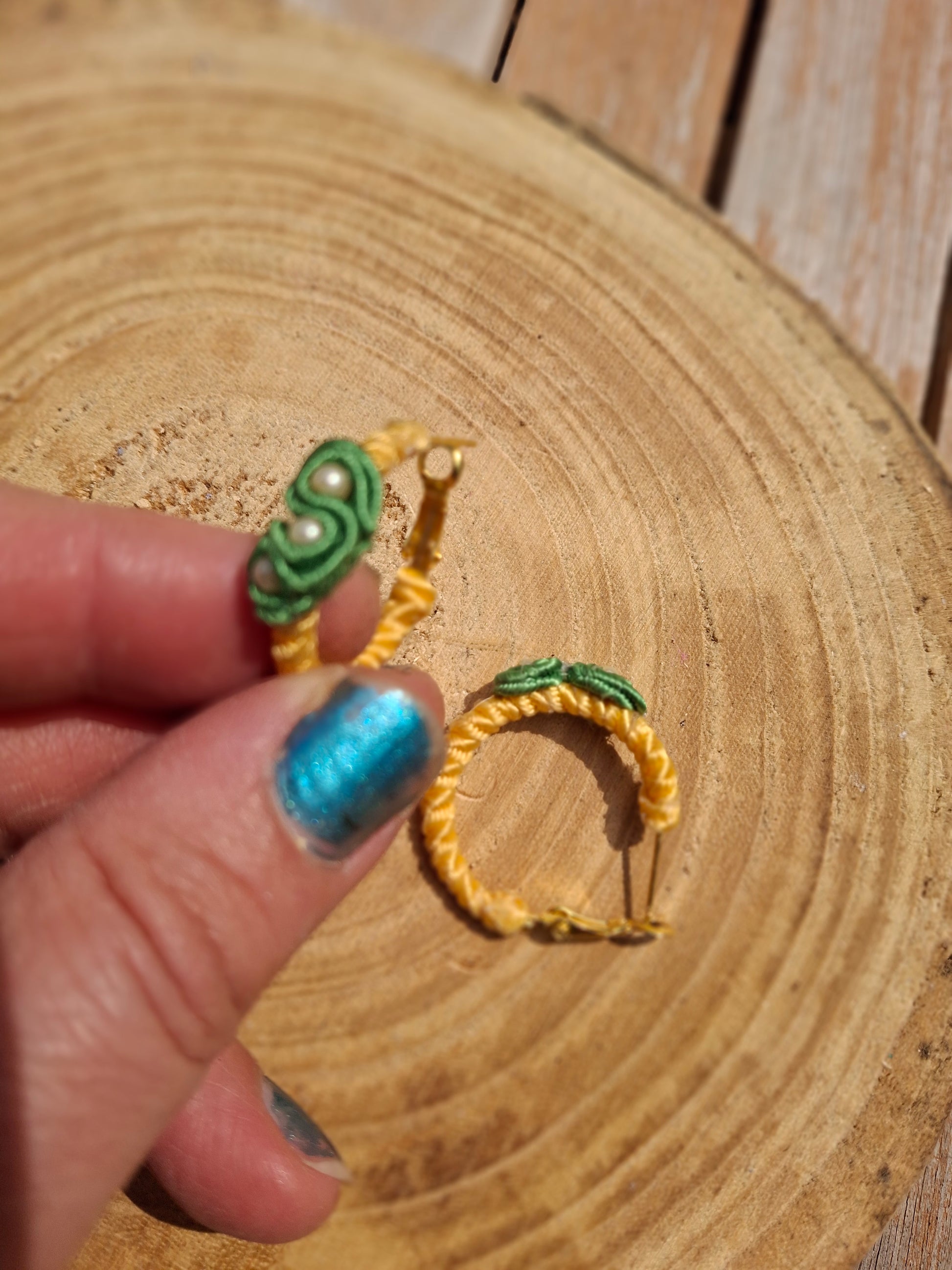 Yellow hoops made with Soutache cord and green beaded design on front of hoop