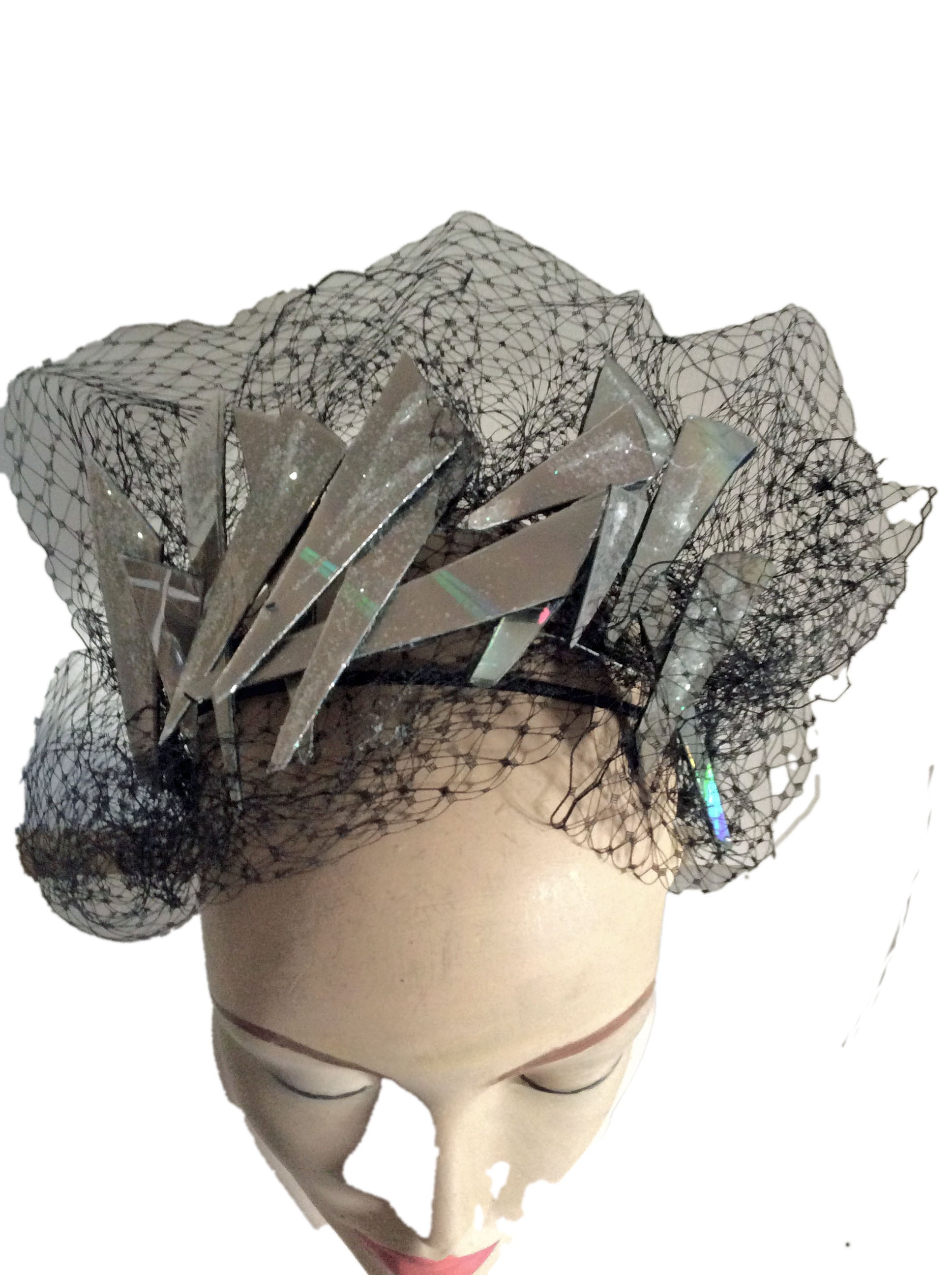 Upcycled from dvd shards with black veiling this headpiece is ideal to stand out in a crowd!
